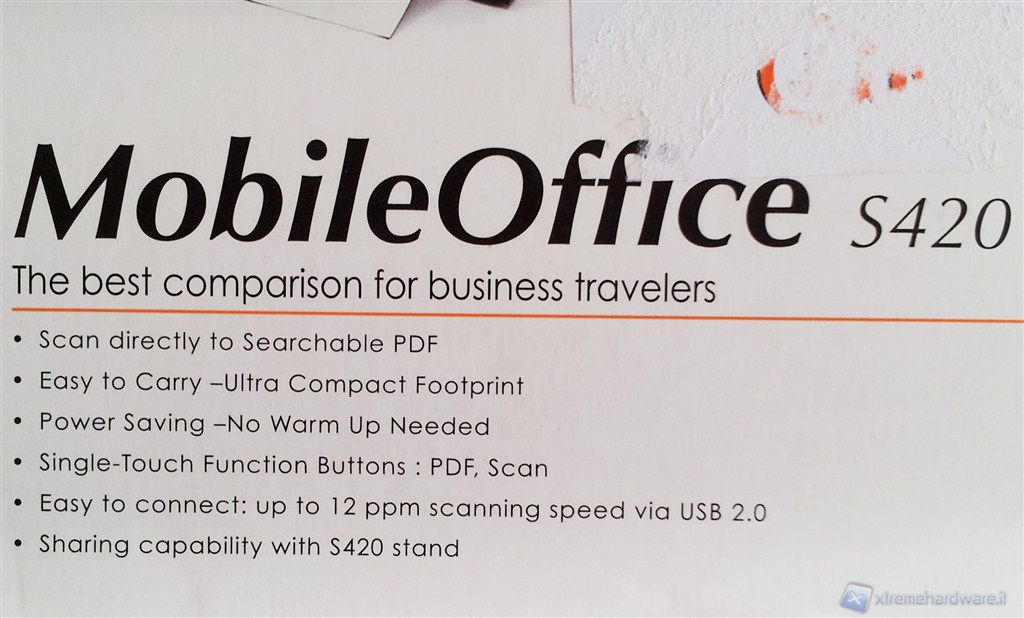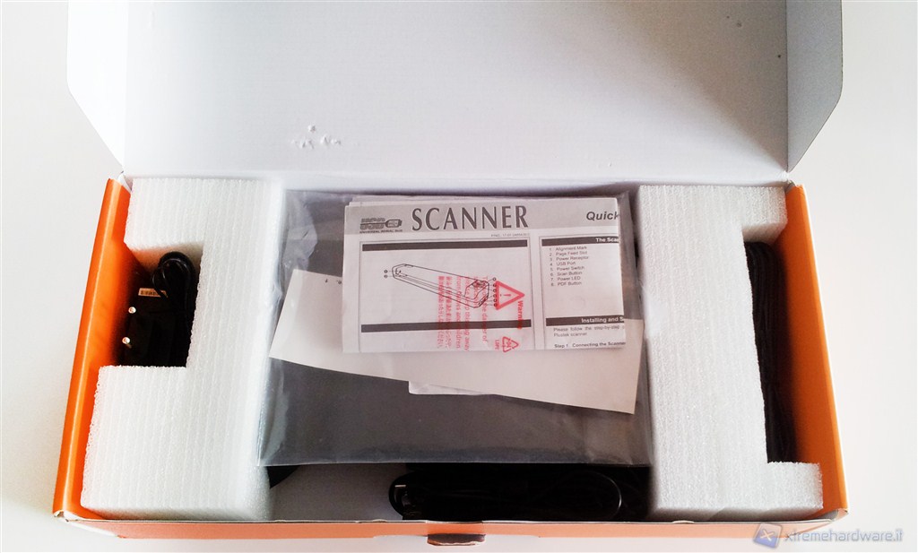 All'interno della confezione, lo scanner MobileOffice S420, come pure il bundle, è ben saldo grazie all'utilizzo di due supporti spugnosi. All'interno di due scompartimenti laterali è alloggiata tutta la cavetteria necessaria a collegare lo scanner alla presa della corrente o eventualmente il cavo che permette l'alimentazione tramite porte USB; sono inoltre presenti i cavi USB necessari al passaggio dei dati.
