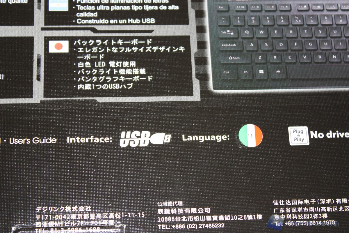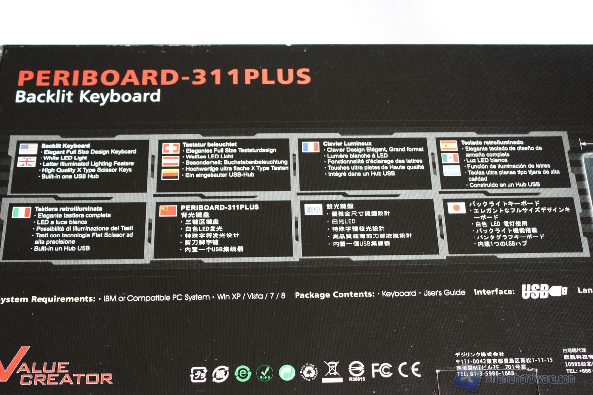 Nella parte posteriore troviamo un’altra immagine della tastiera, questa volta accompagnata dalle dimensioni e dall’elenco completo delle features della Perixx Periboard 311 Plus, tra cui il meccanismo dei tasti Scissor e la pesenza di HUB USB integrato. Non mancano informazioni relative alla compatibilità del prodotto con i piùrecenti sistemi operativi, l’interfaccia USB Plug n Play che ci consentirà di utilizzare la tastiera senza l'ausilio di software o driver dedicati. Inoltre èriportato il layout della tastiera che è IT, ovvero italiano.