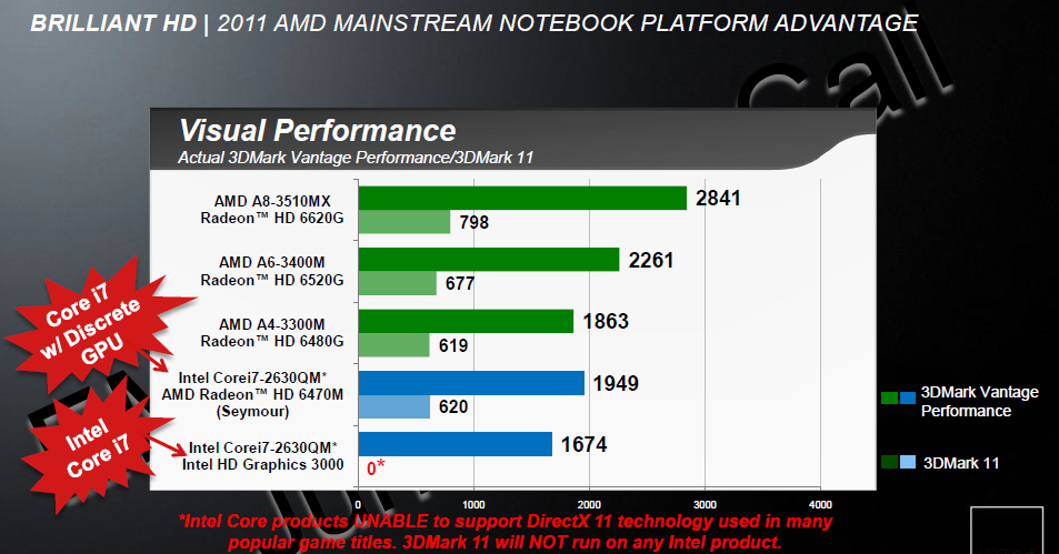 In attesa di poter testare in redazione le APU Llano, vi presentiamo i risultati mostrati da AMD. Indubbiamente la posizione è di netto vantaggio per quanto riguarda le prestazioni 3D rispetto alla controparte Intel, sia in modalità solo APU sia in modalità Dual Graphics, con l'ausilio di una scheda video discreta. Le performance sono superiori, a parità di fascia di mercato, in tutti i giochi testati da AMD e presentati in queste slide. La mancanza di supporto alle DirectX 11 nelle Intel HD 2000 e 3000, impedisce a Intel di competere il alcuni benchmark come il 3D Mark 11.