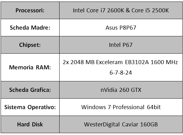 A titolo di comparazione abbiamo riportato i risultati ottenuti con la scheda madre Intel DP67BG "Burrage", in modo da valutare l'eventuale impatto della scheda madre, nei test effettuati.