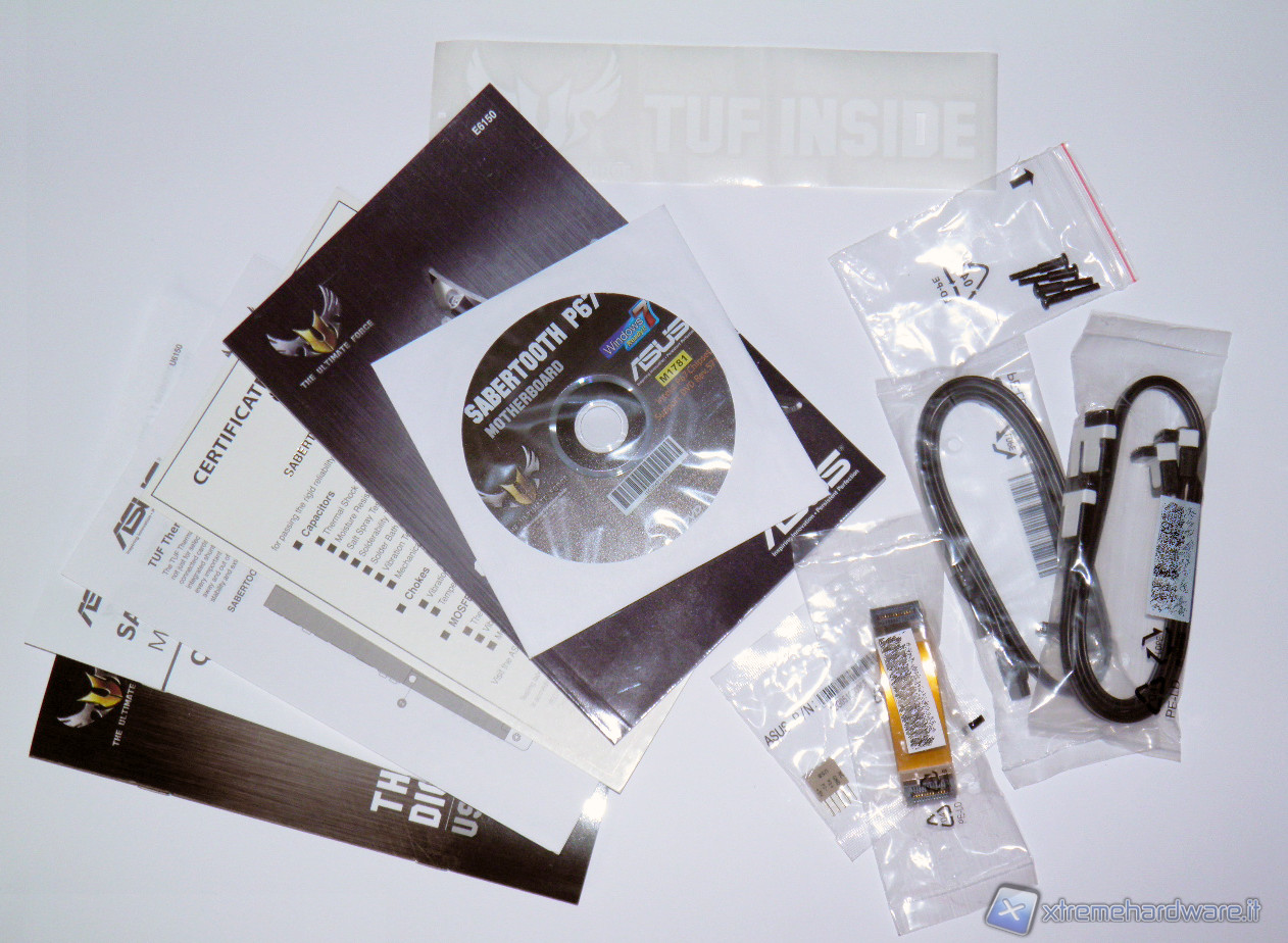 In bundle con la scheda troviamo una dotazione abbastanza standard che comprende 4 cavi SATA (due per lo standard Sata III) con connettori a 90°, un bridge per CrossFire, 4 viti per montare la ventola da 50mm, manuali, cd driver, certificato componenti militari, mascherina posteriore.