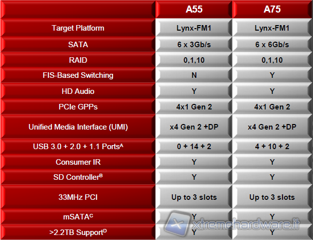 Di seguito riportiamo la tabella comparativa dei due chipset AMD per piattaforme Llano.