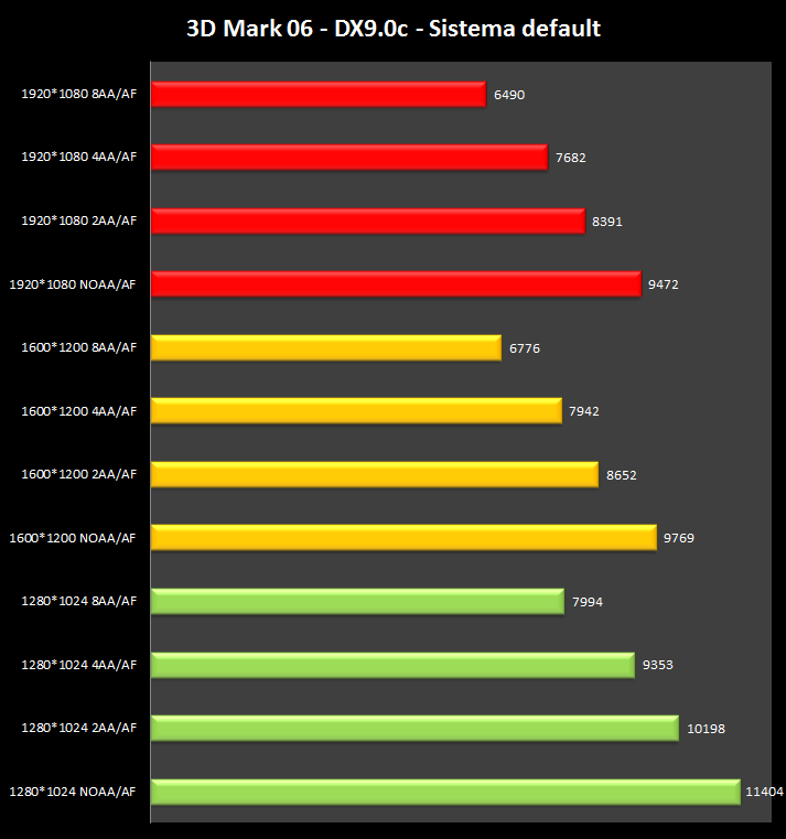 L'applicativo restituisce in output 3 sotto-punteggi: uno per lo SM2.0, uno per la CPU e l'ultimo per lo SM3.0. Il test viene fatto alla risoluzione nativa di 1280*1024, con vari livelli di filtraggio AA e in DirectX 9.0c.