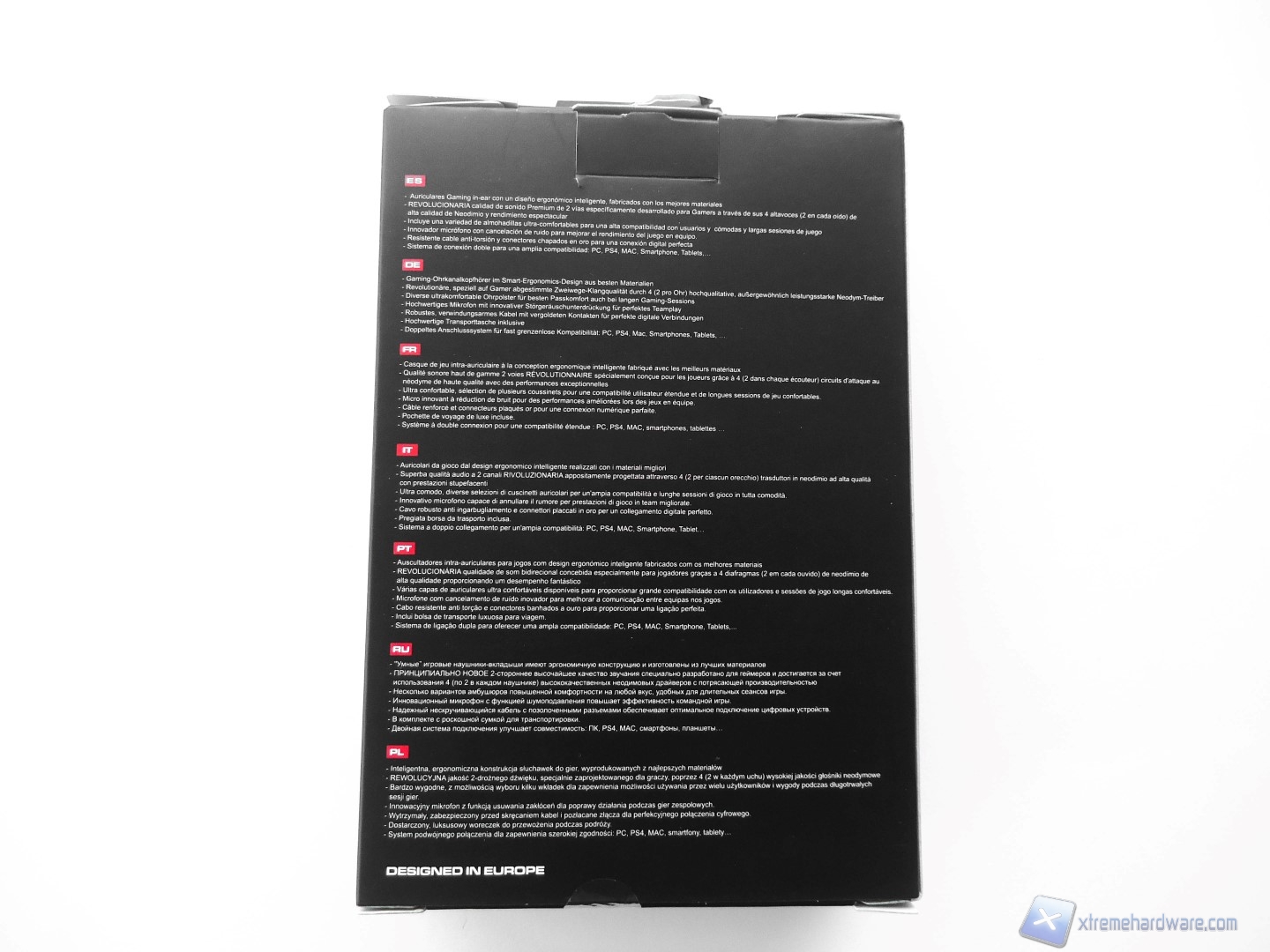Girando la confezione troviamo le varie caratteristiche generali del prodotto scritte in varie lingue, tra cui l’italiano, ed infine sul fondo troviamo una piccola scritta che ci conferma che questo prodotto è stato progettato in Europa.