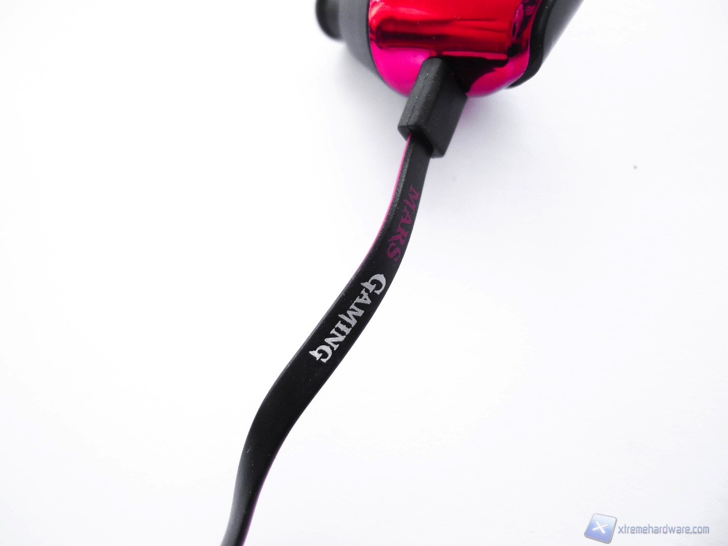 Ora procediamo all’analisi del cavo delle MIH2, che come possiamo ben vedere presenta una doppia colorazione nera-rossa. Il cavo è realizzato con cura ed inoltre presenta il caratteristico design piatto che troviamo ormai in gran parte degli auricolari di una certa fascia. Questo particolare design flat evita che il cavo si ingarbugli creando nodi difficili da sbrogliare mettendo a dura prova la nostra pazienza, soprattutto se riponiamo le cuffie in tasca o in borsa. Appena al di sotto dell’auricolare sul cavo è stampato il logo dell’azienda Mars Gaming in colorazione bianca e rossa.