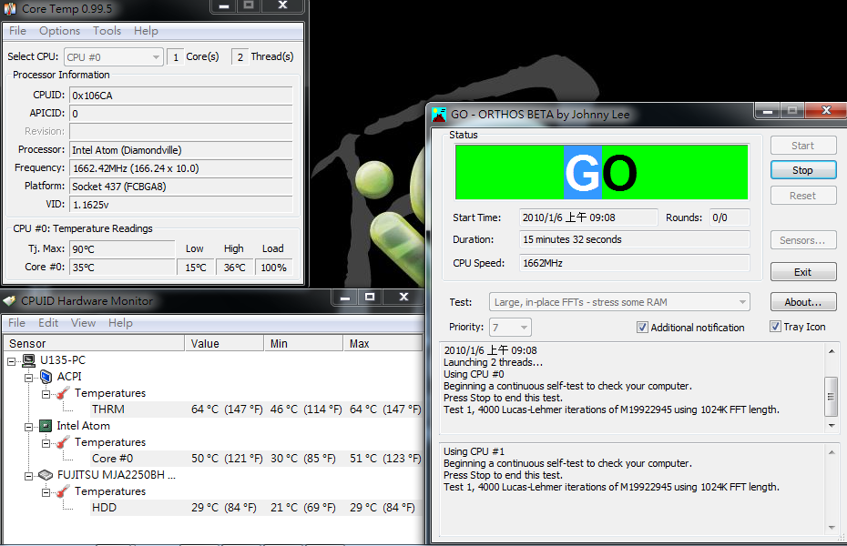 I test di consumo sono stati rilevati con un misuratore di potenza, con batteria staccata. In Idle il consumo è di 9W mentre il full load di 13W. Il consumo è inferiore di circa 5-7W alla precedente piattaforma basata su 945GSE. Questo è un punto di forza della nuova piattaforma PineTrail che è in grado di ridurre ancora di più i consumi dei netbook.