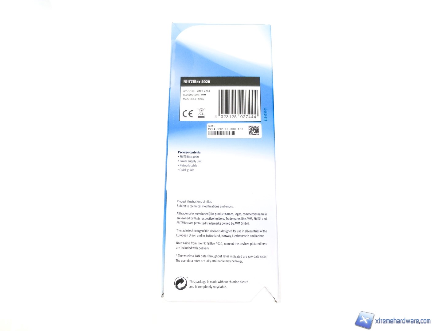 Il piccolo router FRITZ!Box 4020 giungerà in una classica confezione di cartone con su stampate tutte le informazioni tecniche e le immagini illustrative del prodotto.