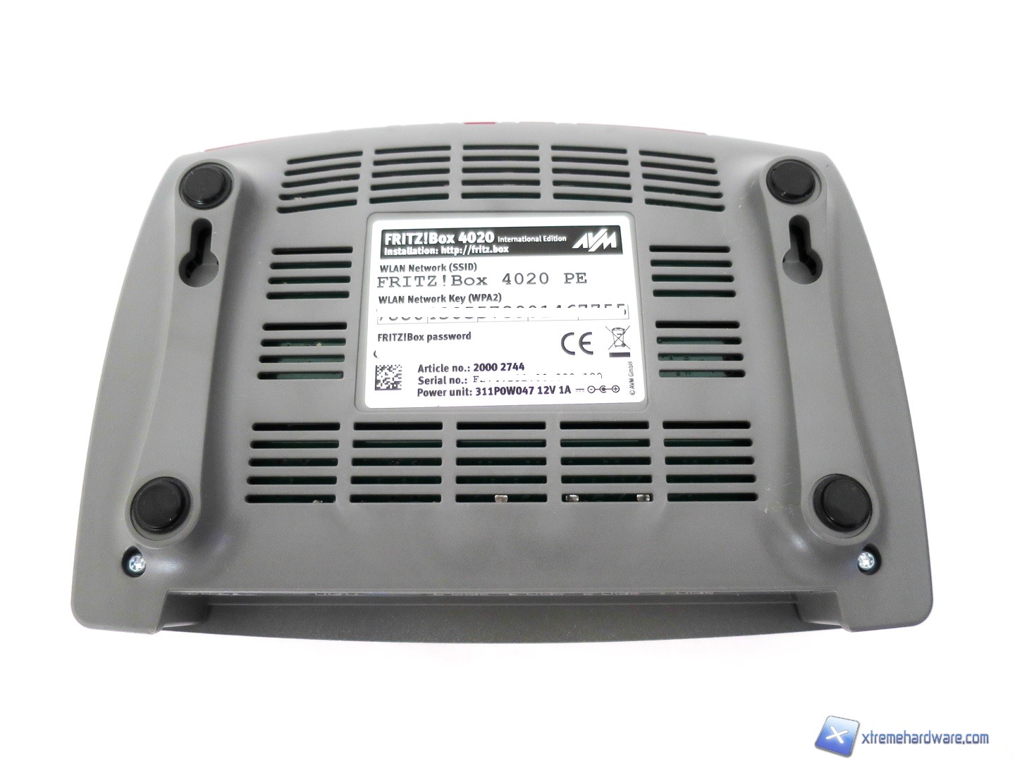 Capovolgendo il FRITZ!Box 4020 possiamo dare uno sguardo anche alla parte inferiore che è caratterizzata per la presenza di quattro piedini in gomma per stabilizzare il router sul piano di appoggio. C’è la possibilità di installarlo anche a muro, risparmiando spazio (previo acquisto di fischer e viti non incluse nel bundle). Infine, al solito, è presente un adesivo di generose dimensioni con riportati i dati per l’accesso al pannello di gestione, la chiave di cifratura standard, il serial number ed altre info.