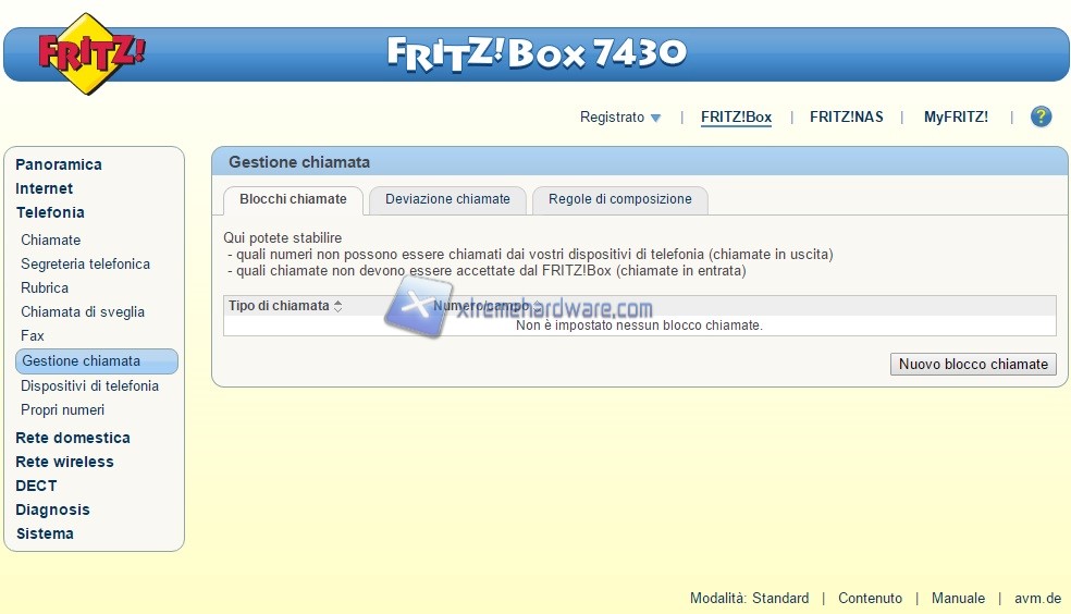 Passiamo ora al Menù ‘Telefonia’’ dal quale potremo accedere a diverse impostazioni anche avanzate per configurare il nostro telefono Voip o creare un sistema con segreteria telefonica ed avvisi di chiamata via mail. Funzioni che rendono il FRITZ!Box 7430 un tuttofare della nostra rete. Non manca una Rubrica telefonica, un servizio FAX o ancora il poter controllare quali dispositivi sono connessi.