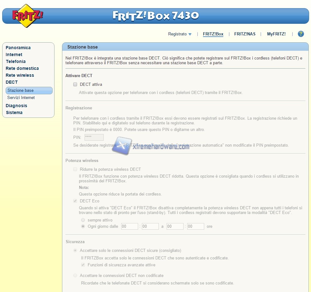 Interessante Menù e caratteristica presente nel FRITZ!Box 7430 è sicuramente ‘’DECT’’ che ci darà modo di attivare il modulo/base DECT integrato nel prodotto e associare un cordless che abbiamo a casa sfruttando dunque Internet per chiamare dimenticandoci anche della base con cui veniva fornito il cordless. Funzione notevole che renderà la casa di un dato utente quasi e del tutto domotica e interconnessa.