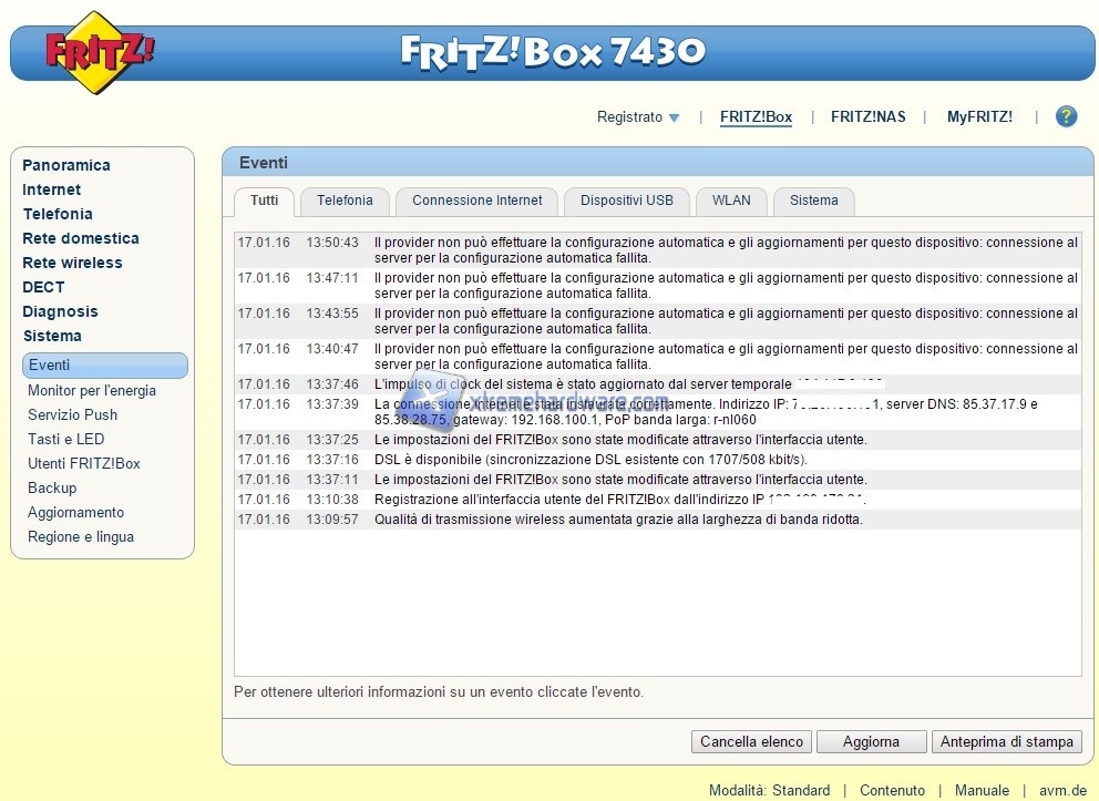 Infine il Menù ‘’Sistema’’ dal quale potremo eseguire dei log sugli eventi del router, della sicurezza, dei consumi energetici e molto altro. Inoltre tramite l’applicazione FRITZ!Push potremo ricevere tali log nella nostra casella email e tenere traccia anche a distanza. Non dimentichiamo ovviamente la possibilità di settare determinati eventi per il LED Info, visto in precedenza, aggiornare il firmware del FRITZ!Box quando ve ne sarà uno disponibile, ri-settare la lingua e paese e molto altro.