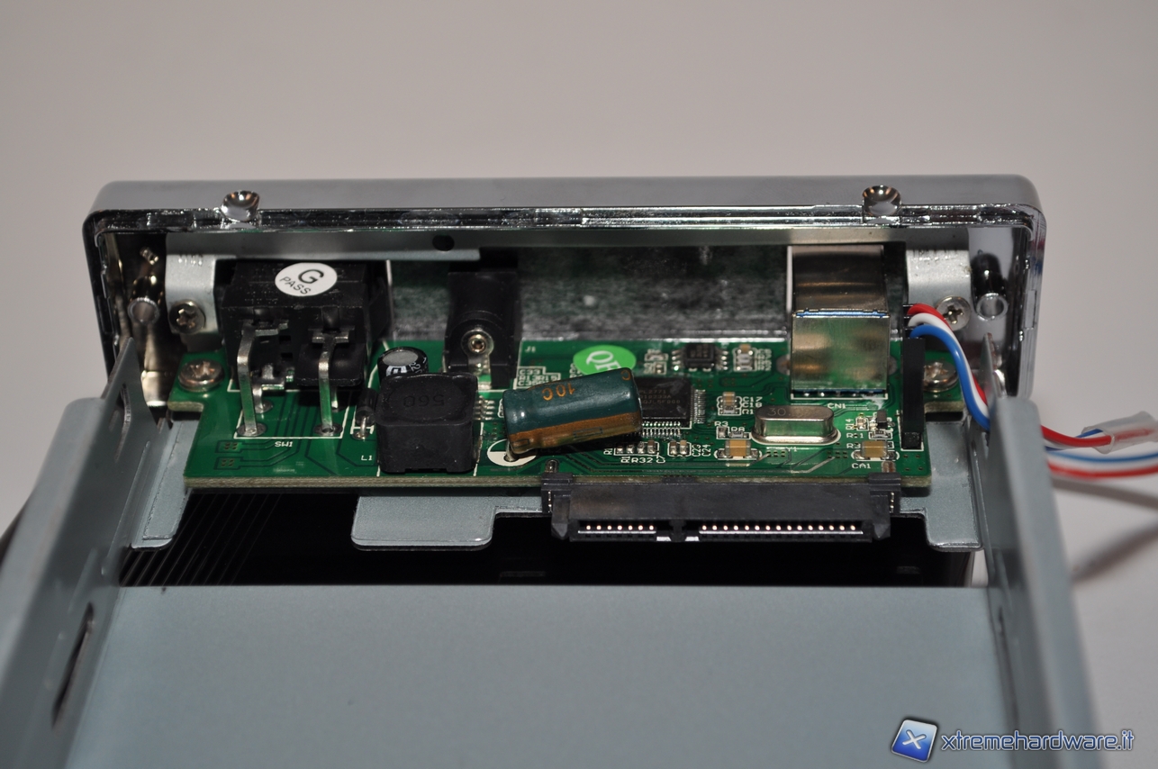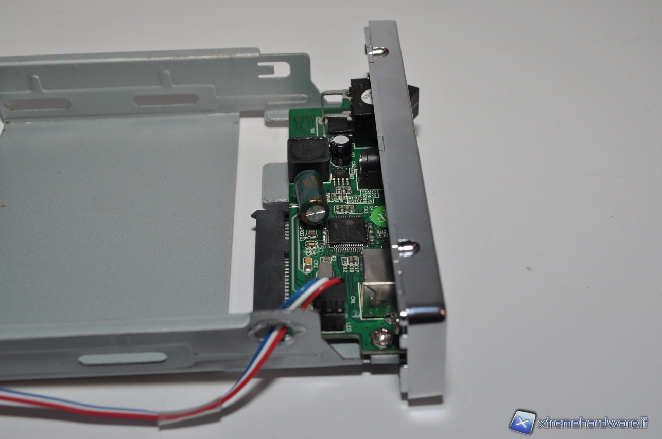 Ecco come si presenta l’interno del box Akasa. A destra troviamo i connettori Sata che andranno collegati dentro l’hard-disk. Basterà poi fissare con delle viti il disco fisso alla lista scorrevole ed il nostro hard disk è pronto per essere collegato al PC.