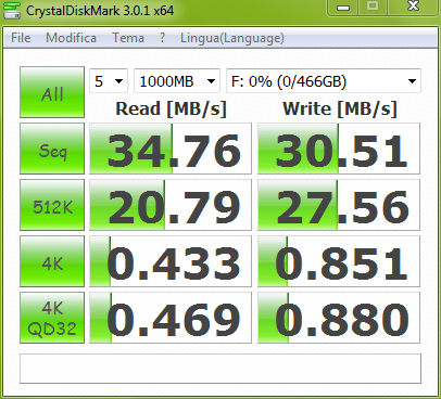 I risultati ottenuti sono relativamente bassi, ma comunque la differenza tra il collegamento USB 2.0 e quello USB 3.0 rimane netta.