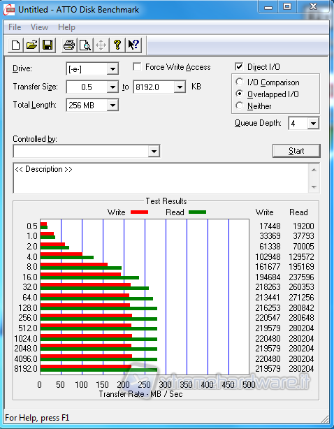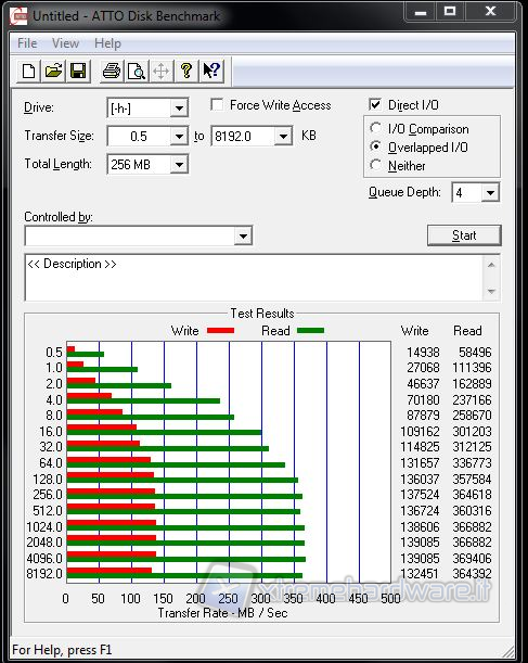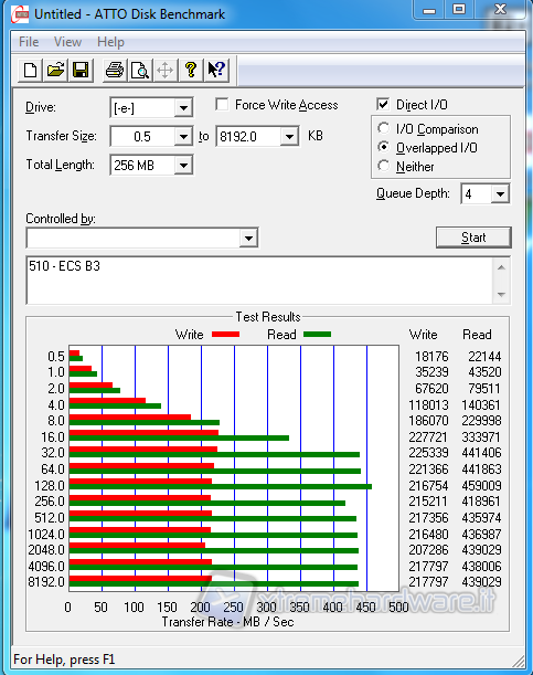 ATTO che è un benchmark gratuito che esegue dei semplici test sia di scrittura sia di lettura in modalità sequenziale adoperando una Queue Depth (file in coda) di 4. Per quanto concerne il test di scrittura vediamo che l’interfaccia Marvell risulta essere nettamente inferiore anche dell’Intel 3Gb/s, mentre particolarmente interessante risulta essere il test di lettura, dove nel pattern 4KB (4.0) il Marvell risulta avere un boost prestazionale già a partire da questo algoritmo.