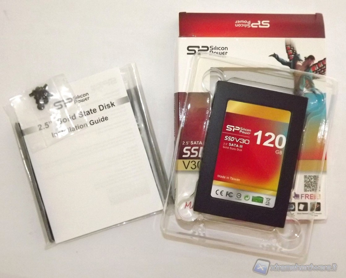Il Solid State Disk è alloggiato in una confezione di cartone con lo sfondo principalmente di colore bianco. Sulla parte frontale è possibile, tramite un'apposita finestra, osservare fisicamente l'SSD Velox V30. Come è possibile notare dalle foto, nella parte frontale, spiccano alcune informazioni preliminari, come la dicitura del modello che in questo caso è V30, il form factor 2.5", interfaccia Sata III 6 Gbps e la dicitura SSD che ci fa capire che si tratta di un Solid State Disk e non di un disco meccanico tradizionale. Naturalmente non mancano il logo di Silicon-Power ed altri piccoli loghi come Sata III 6 Gbps, Silent Operation, Low Power Consumption, Shock Resistant e Adapter Bracket incluso nella dotazione.