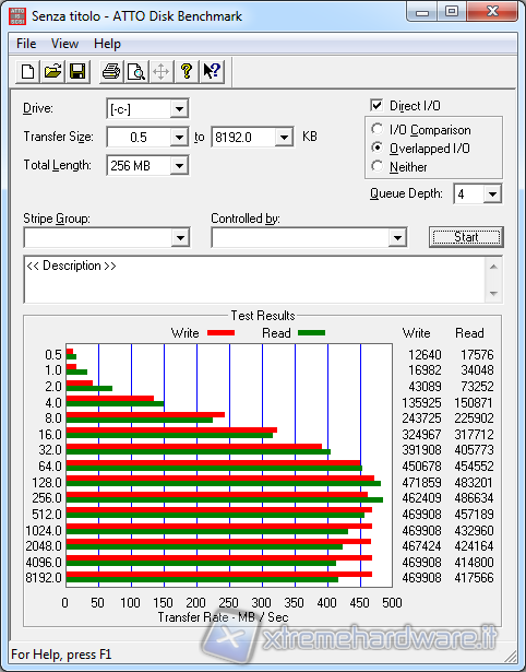 Atto è un benchmark gratuito che esegue dei semplici test in lettura e in scrittura in modalità sequenziale adoperando una Queue Depth (file in coda) di 4.