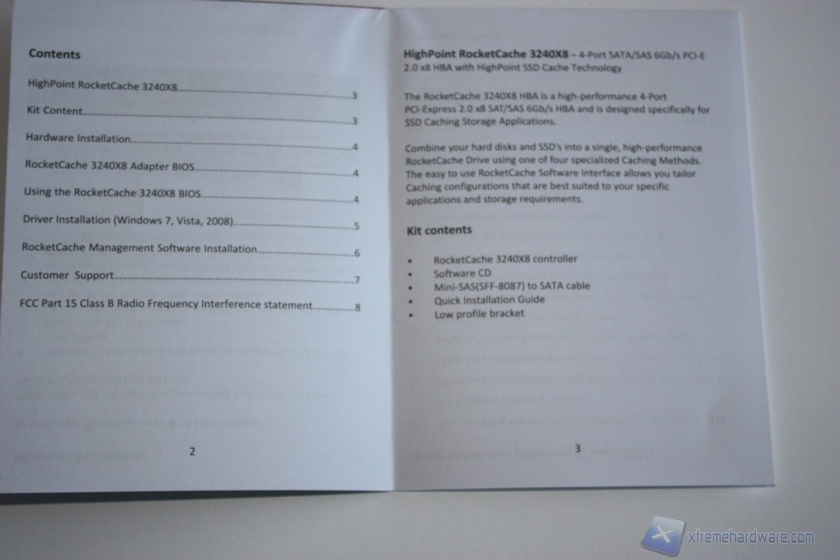 Una volta estratto dalla confezione ci troviamo di fronte ad un cofanetto con apertura anteriore in cartone. Aperto il cofanetto troviamo come prima cosa i cavi, riposti in una busta di plastica, che ci serviranno a collegare i nostri hard disk. Sotto troviamo un ritaglio di gomma piuma di colore nero sotto la quale troveremo in una busta antishock il controller RocketCache 3240x8 ed il mini bracket con le viti nel caso volessimo montare il controller in un case di tipo slim o meglio in un rack per server 1U. Sotto l'altro strato di gomma piuma troveremo il manauale d'installazione ed il CD contenente il software "HighPoint RocketCache Management" e i driver necessari al corretto funzionamento del controller sui sistemi operativi Windows, Mac e Linux. Come abbiamo notato tutto è stato riposto con estrema cura ed attenzione per la relativa integrità del prodotto e dei suoi accessori.