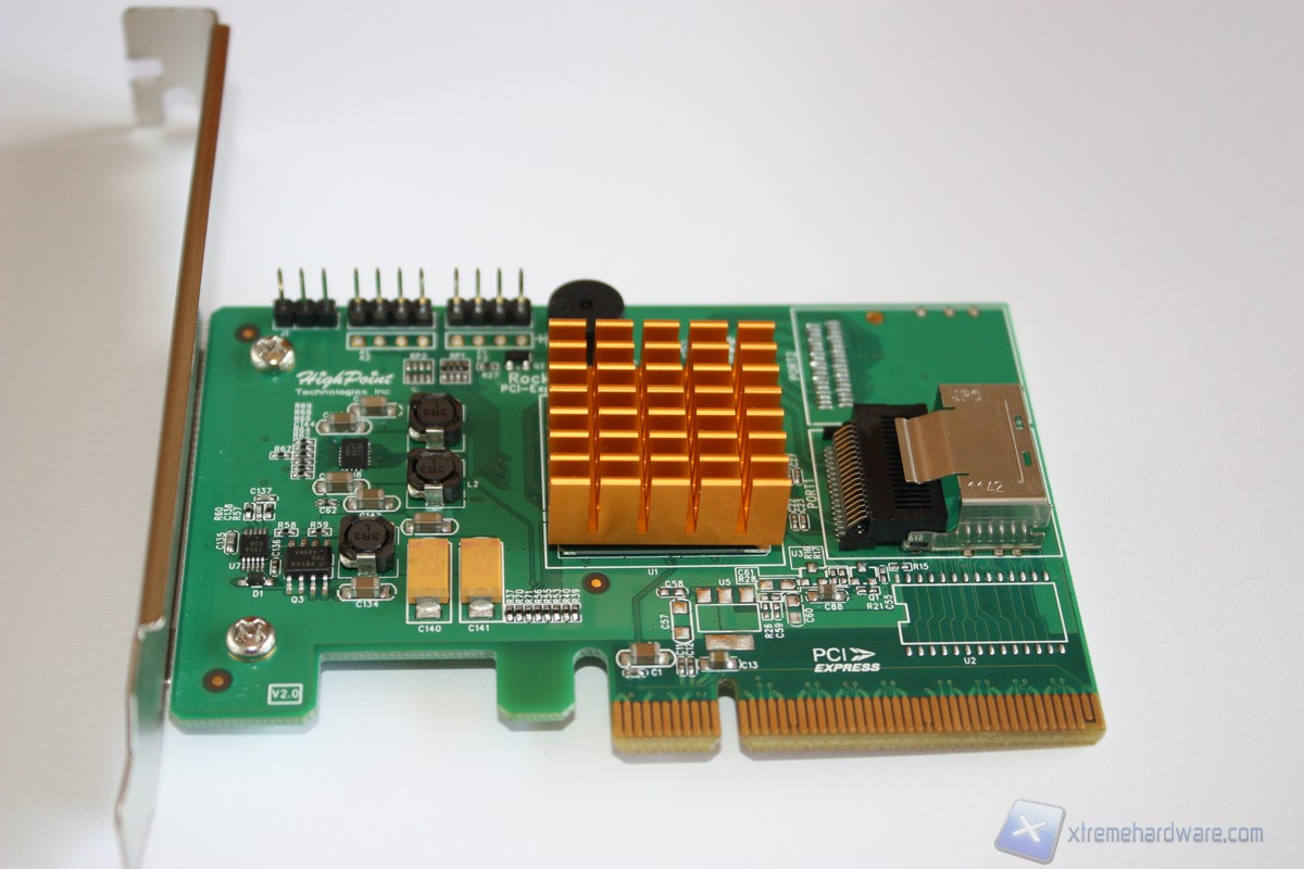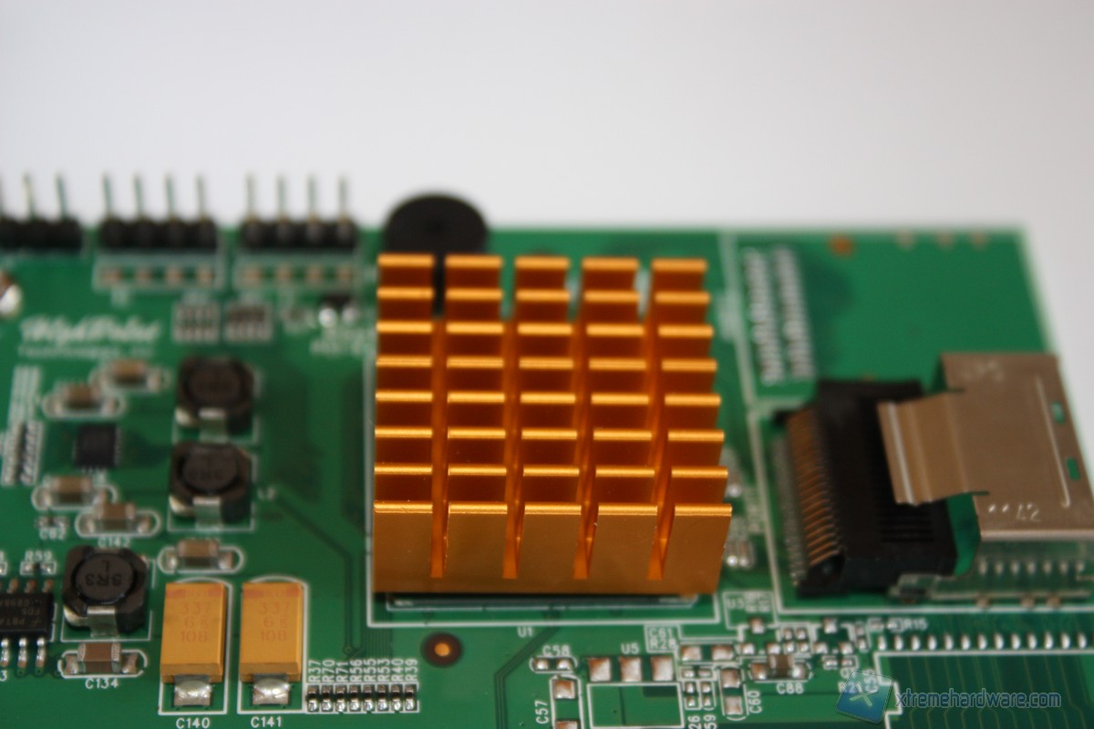 Passiamo ora all'analisi del controller. Le dimensioni del RocketCache 3240x8 sono davvero ridotte, difatti esso misura solo 96.27 x 57.15 x 1.52 mm (L x W x H) e potrà essere quindi montato anche in rack 1U. Ciò che risalta immediatamente ad una prima occhiata è il grosso dissipatore di colore rame presente sul controller di gestione che in questo caso è un Marvell 88SE9485, controller che come abbiamo visto dalle caratteristiche riesce a gestire senza problemi hard disk e SSD con interfaccia SATA III con trasfare-rate di 6Gb/s massimi per un totale di ben 8 unità. Il controller RocketCache 3240x8 ha un PCB di colore verde e sono presenti pochi componenti elettronici per la gestione elettrica dello stesso. Notiamo la serigrafia poco più su del pettine che Pci-Express, in questa versione 2.0, e quindi retrocompatibile anche con slot Pci-Express 1.0.