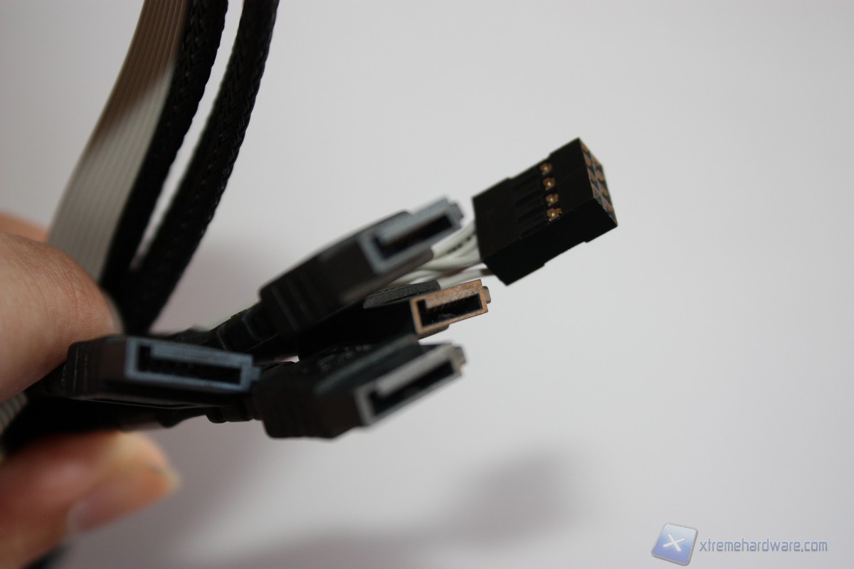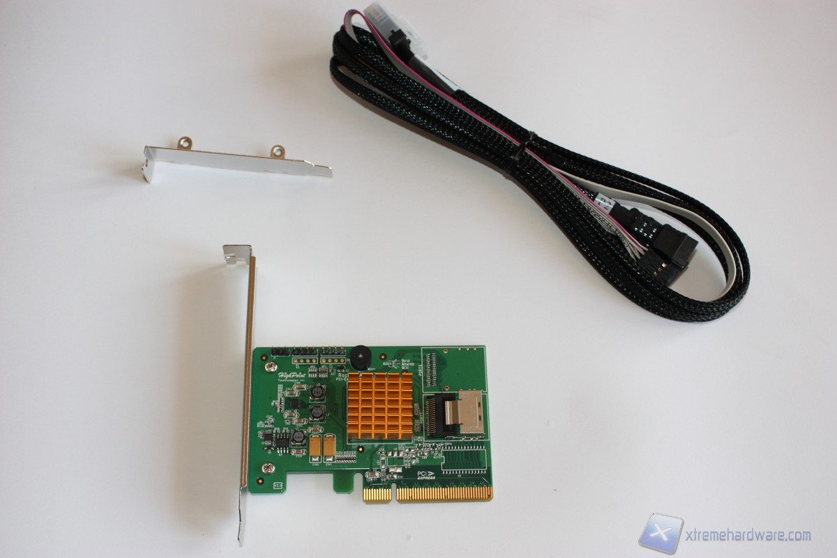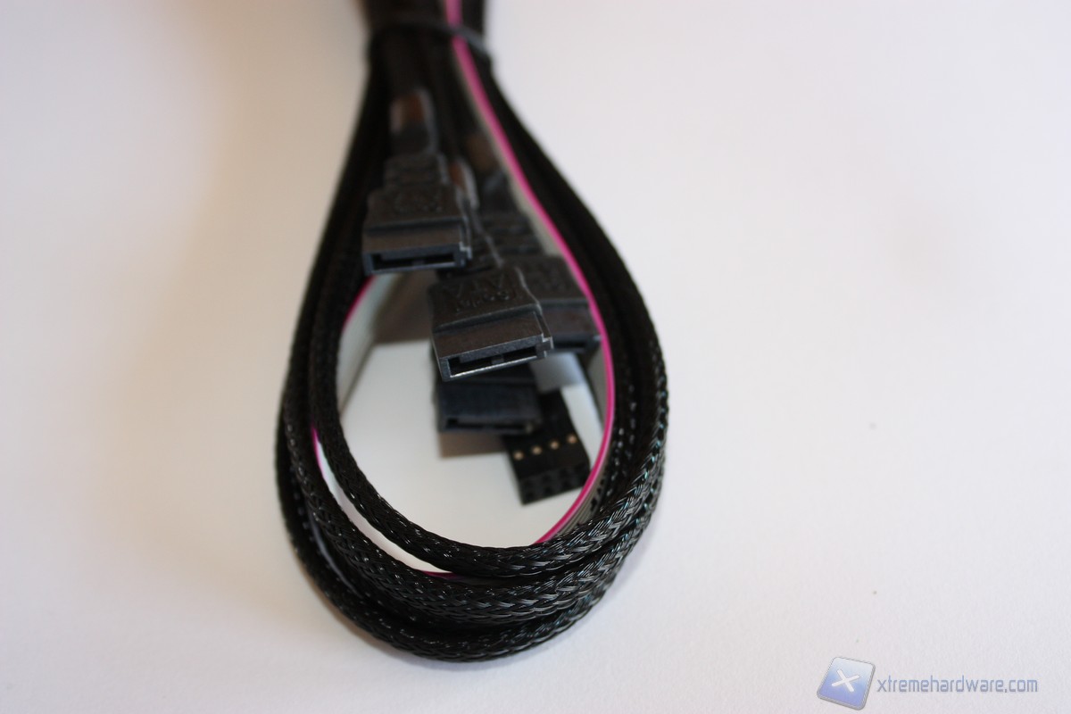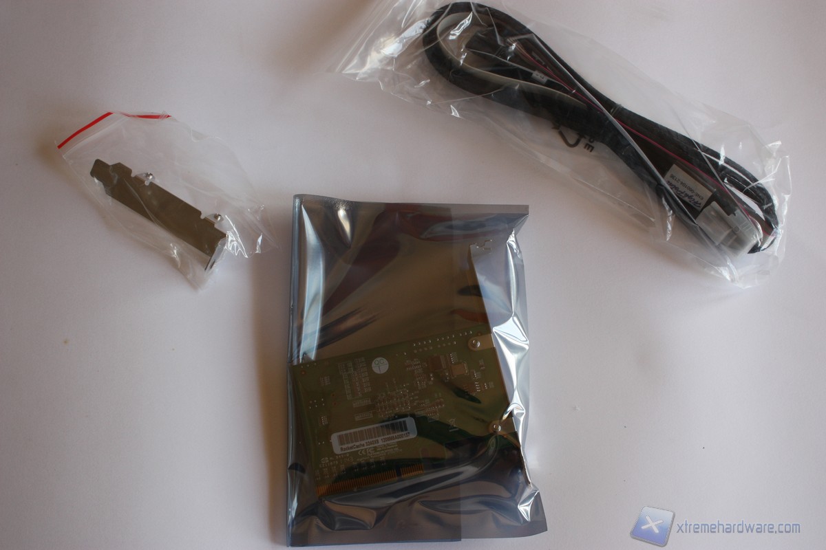 Ci troviamo ora di fronte al bundle del RocketCache 3240x8 composto dal bracket low profile, dal controller Rocketcache 3240x8 e dal set di cavi, da notare, sleevati con una garza nera. Andando ad analizzare il set di cavi notiamo prima di tutto la cura per i dettagli. Ad un estremità dei cavi notiamo il cappuccio in plastica a protezione del connettore SFF-8087 che andrà collegato nella porta dedicata sul controller. L'estremità opposta del set di cavi è composta da quattro connettori SATA che come abbiamo detto prima sono compatibili con hard disk e SSD SATA III, quindi con un transfer-rate di 6 Gb/s.